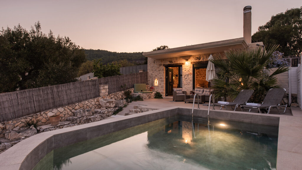Το κατάλυμα είναι πέτρινο και μάλιστα χτισμένο πάνω σε ένα βράχο στη βάση του οποίου υπάρχει μια πραγματική μικρή σπηλιά, φροντισμένη και φωτισμένη με υπέροχους συνδιασμούς. Η κουζίνα είναι πλήρως εξοπλισμένη με φούρνο, ψυγείο, πλυντήριο πιάτων ενώ στο μπάνιο που είναι φτιαγμένο από πέτρα επίσης θα βρείτε ντουζ με στήλη υδρομασάζ και βέβαια πλυντήριο ρούχων και πιστολάκι μαλλιών.