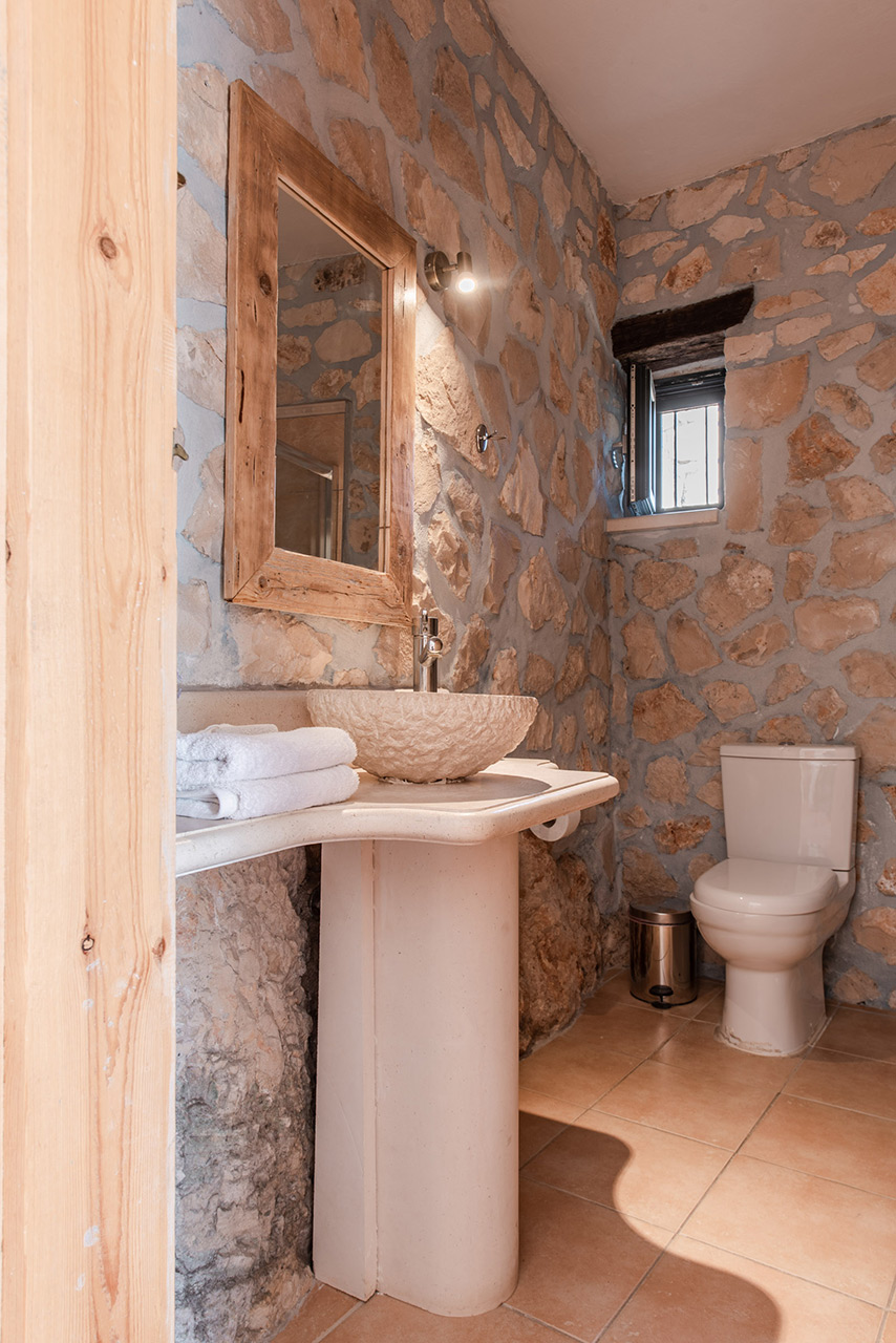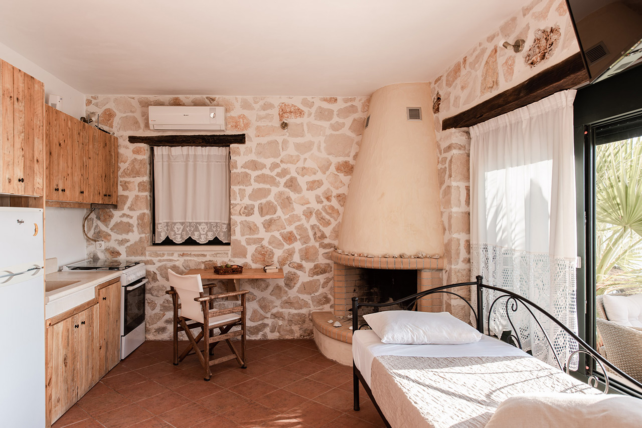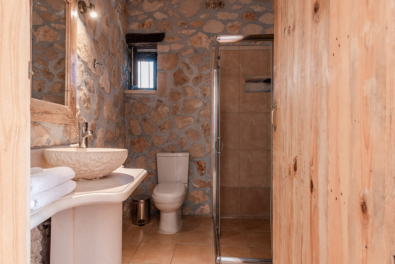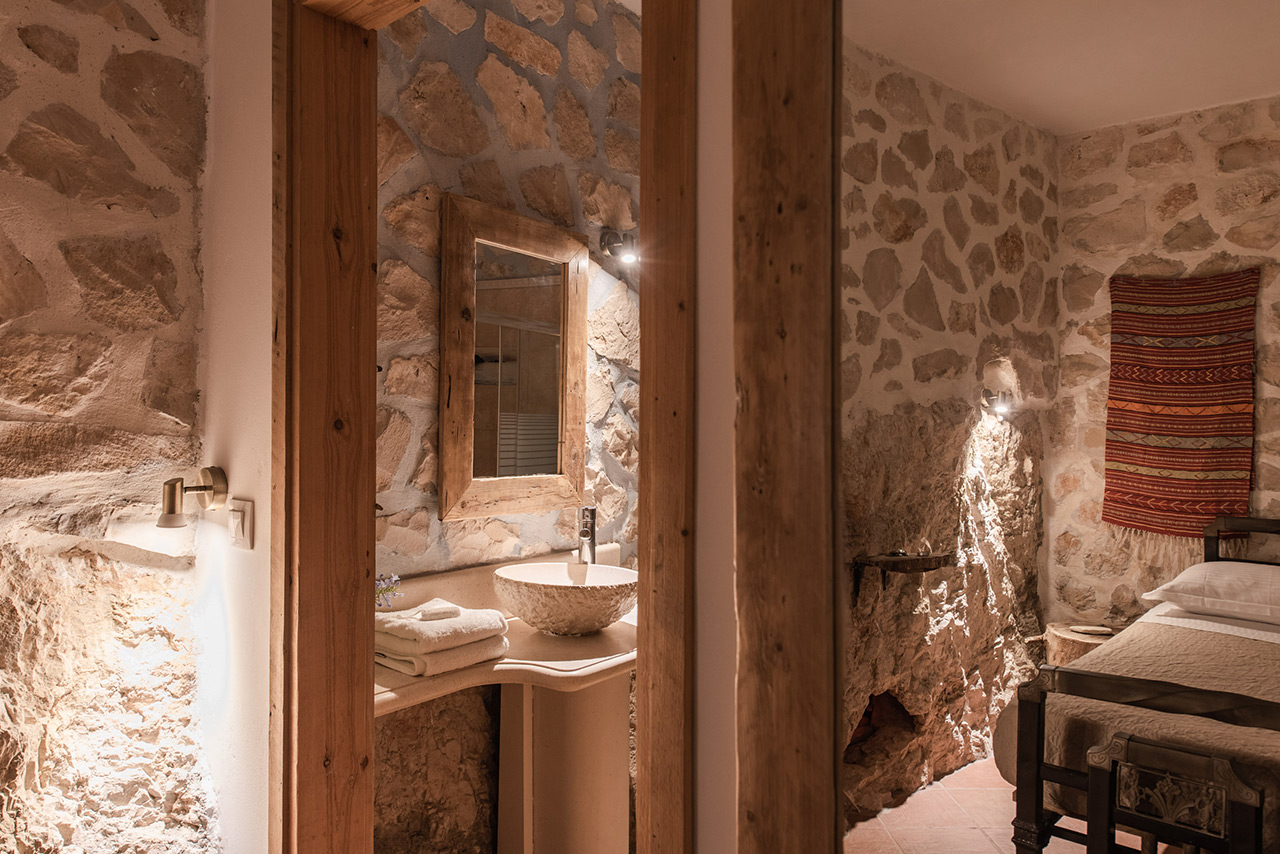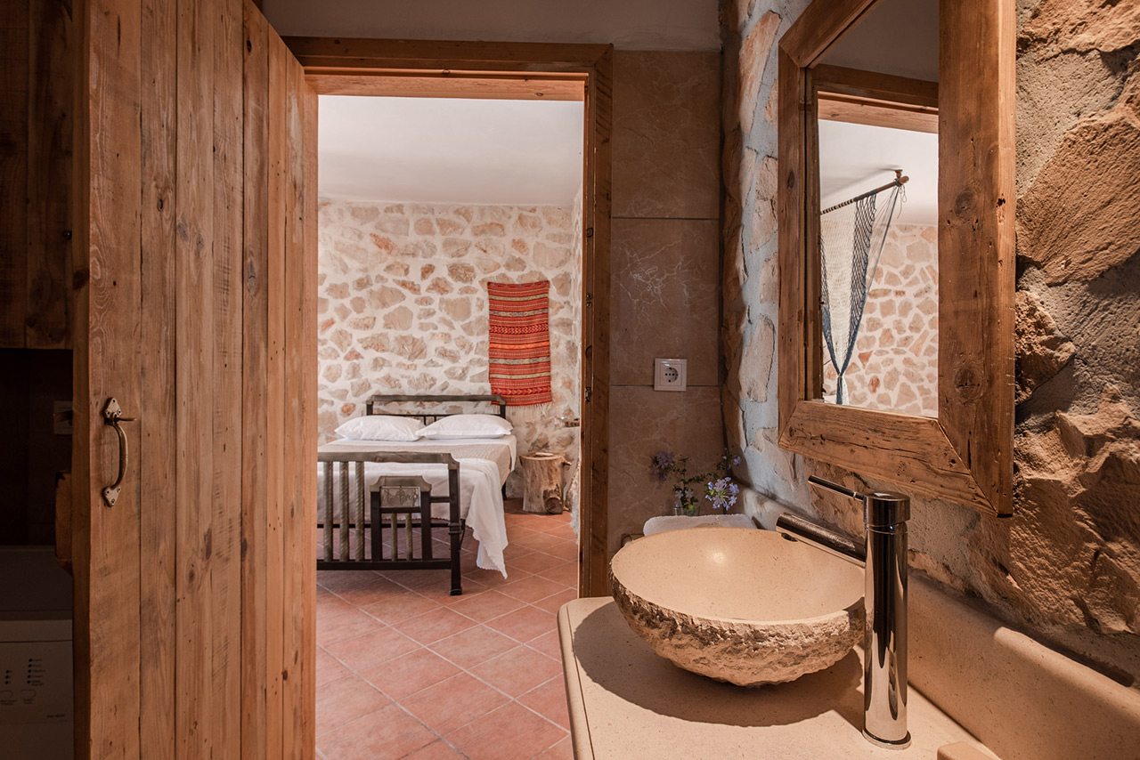 Το κατάλυμα είναι πέτρινο και μάλιστα χτισμένο πάνω σε ένα βράχο στη βάση του οποίου υπάρχει μια πραγματική μικρή σπηλιά, φροντισμένη και φωτισμένη με υπέροχους συνδιασμούς. Η κουζίνα είναι πλήρως εξοπλισμένη με φούρνο, ψυγείο, πλυντήριο πιάτων ενώ στο μπάνιο που είναι φτιαγμένο από πέτρα επίσης θα βρείτε ντουζ με στήλη υδρομασάζ και βέβαια πλυντήριο ρούχων και πιστολάκι μαλλιών.