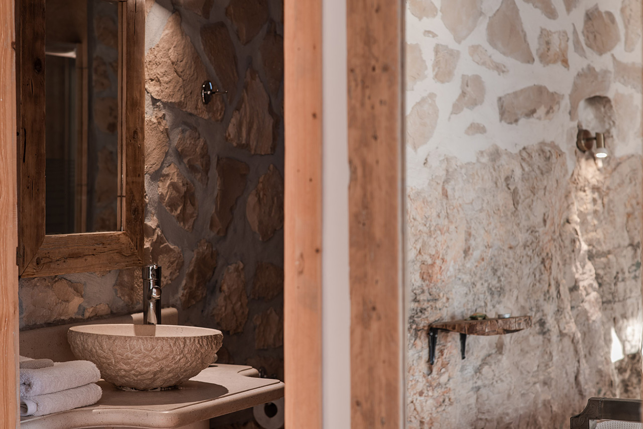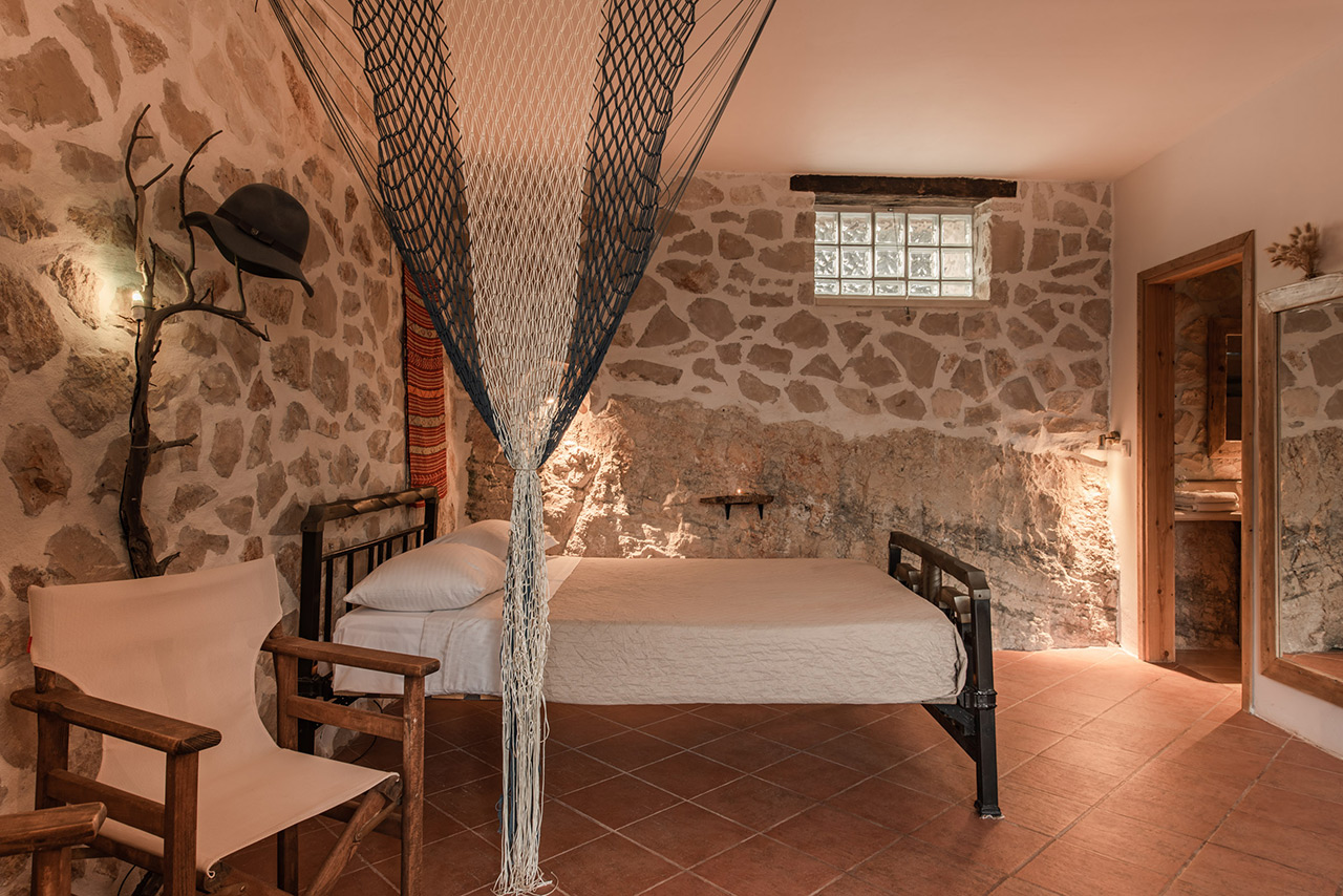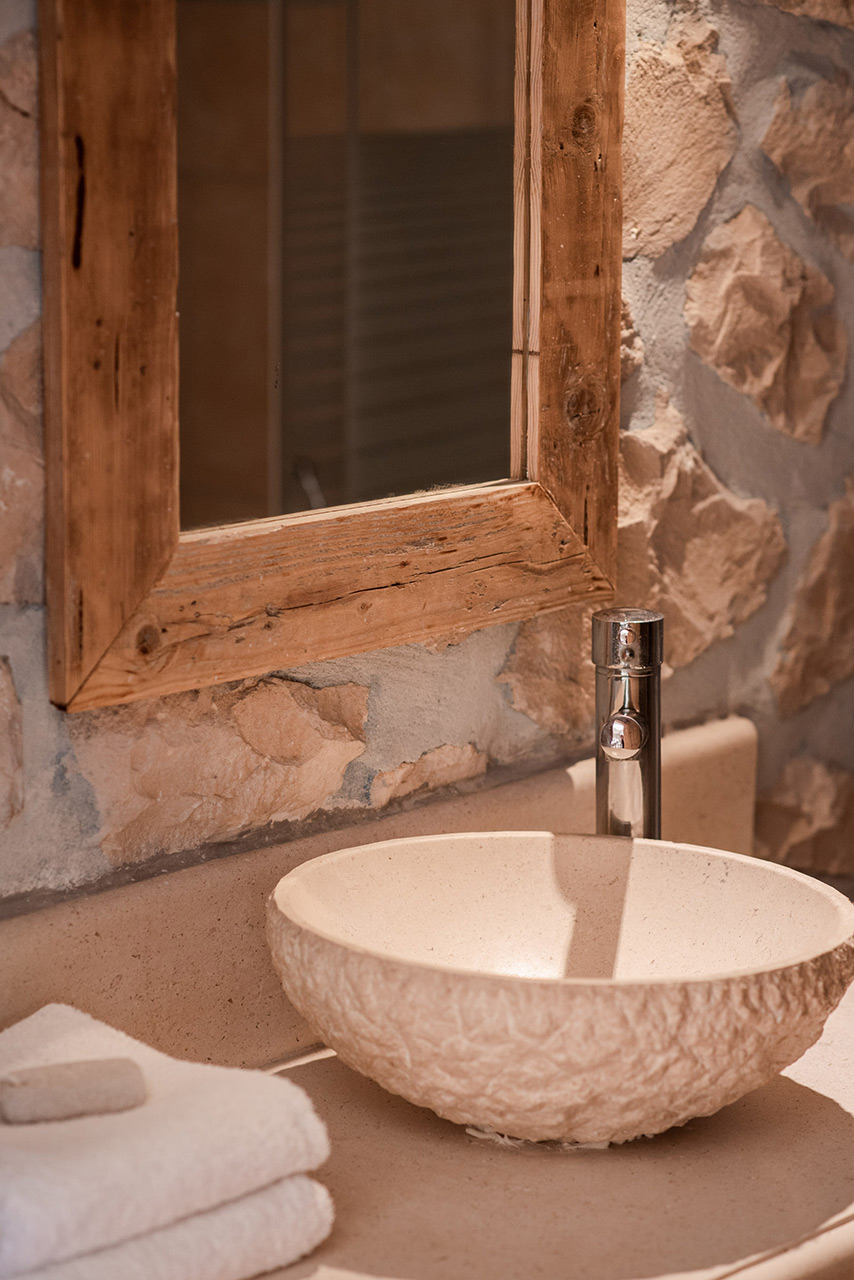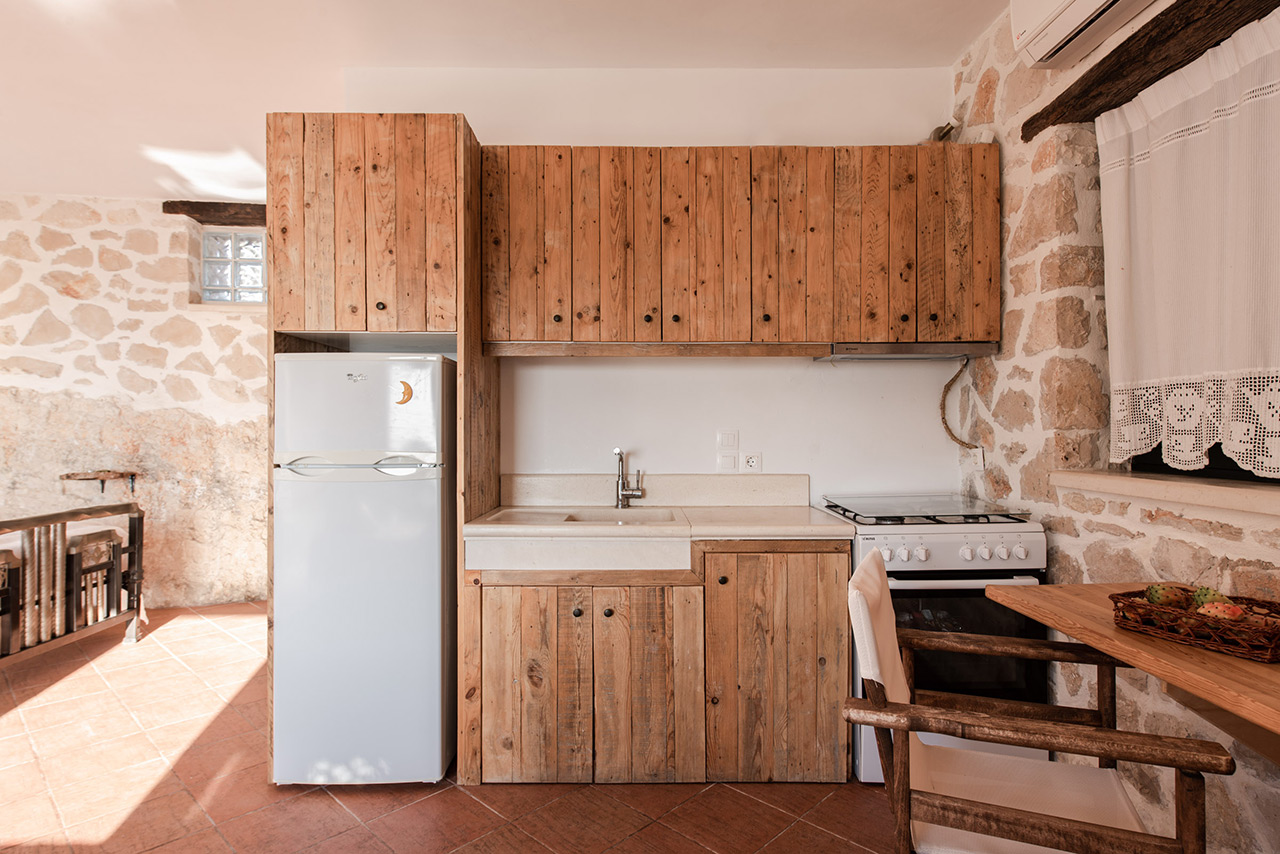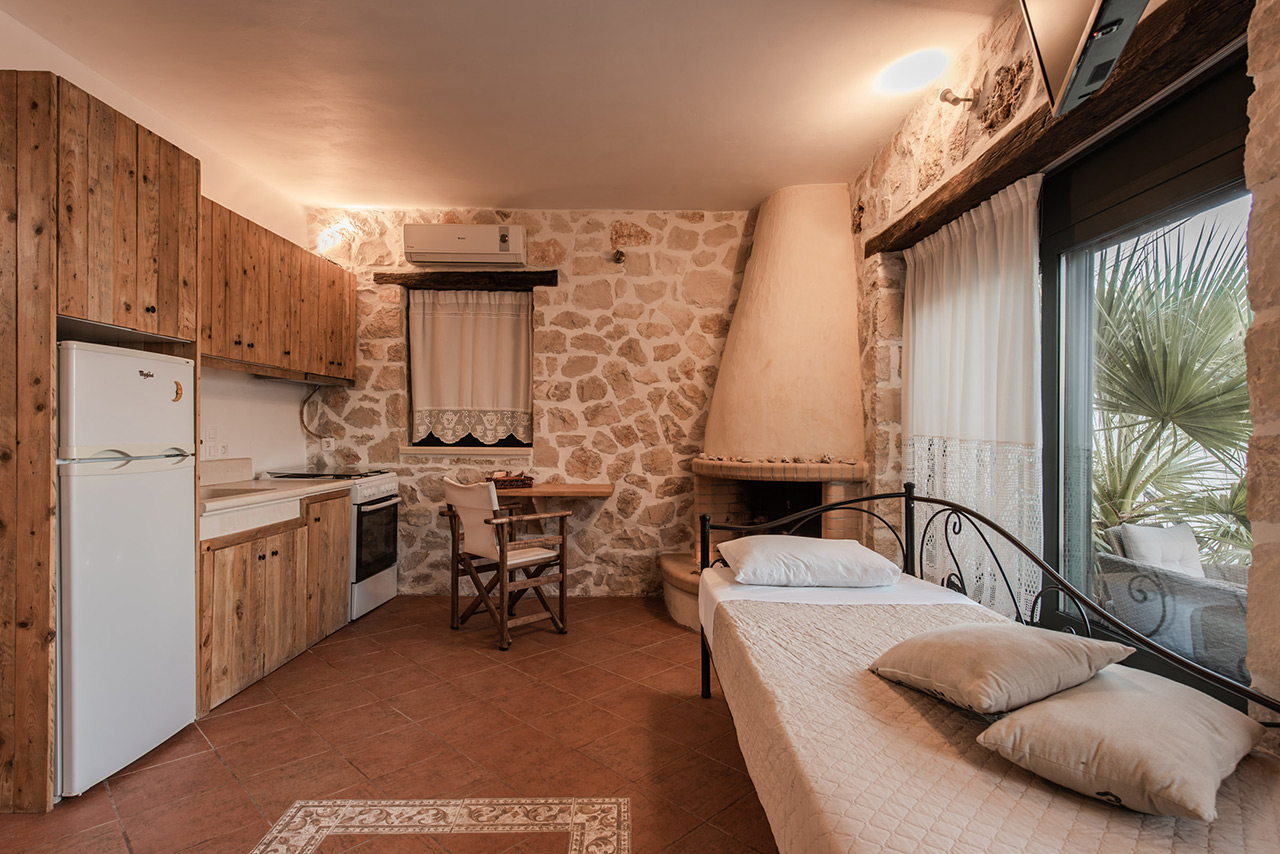 Το κατάλυμα είναι πέτρινο και μάλιστα χτισμένο πάνω σε ένα βράχο στη βάση του οποίου υπάρχει μια πραγματική μικρή σπηλιά, φροντισμένη και φωτισμένη με υπέροχους συνδιασμούς. Η κουζίνα είναι πλήρως εξοπλισμένη με φούρνο, ψυγείο, πλυντήριο πιάτων ενώ στο μπάνιο που είναι φτιαγμένο από πέτρα επίσης θα βρείτε ντουζ με στήλη υδρομασάζ και βέβαια πλυντήριο ρούχων και πιστολάκι μαλλιών.