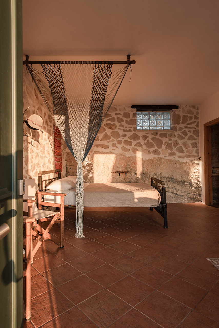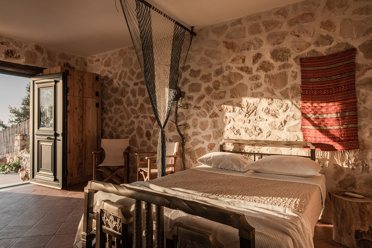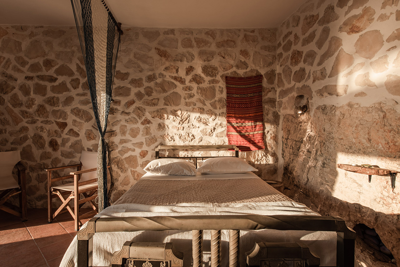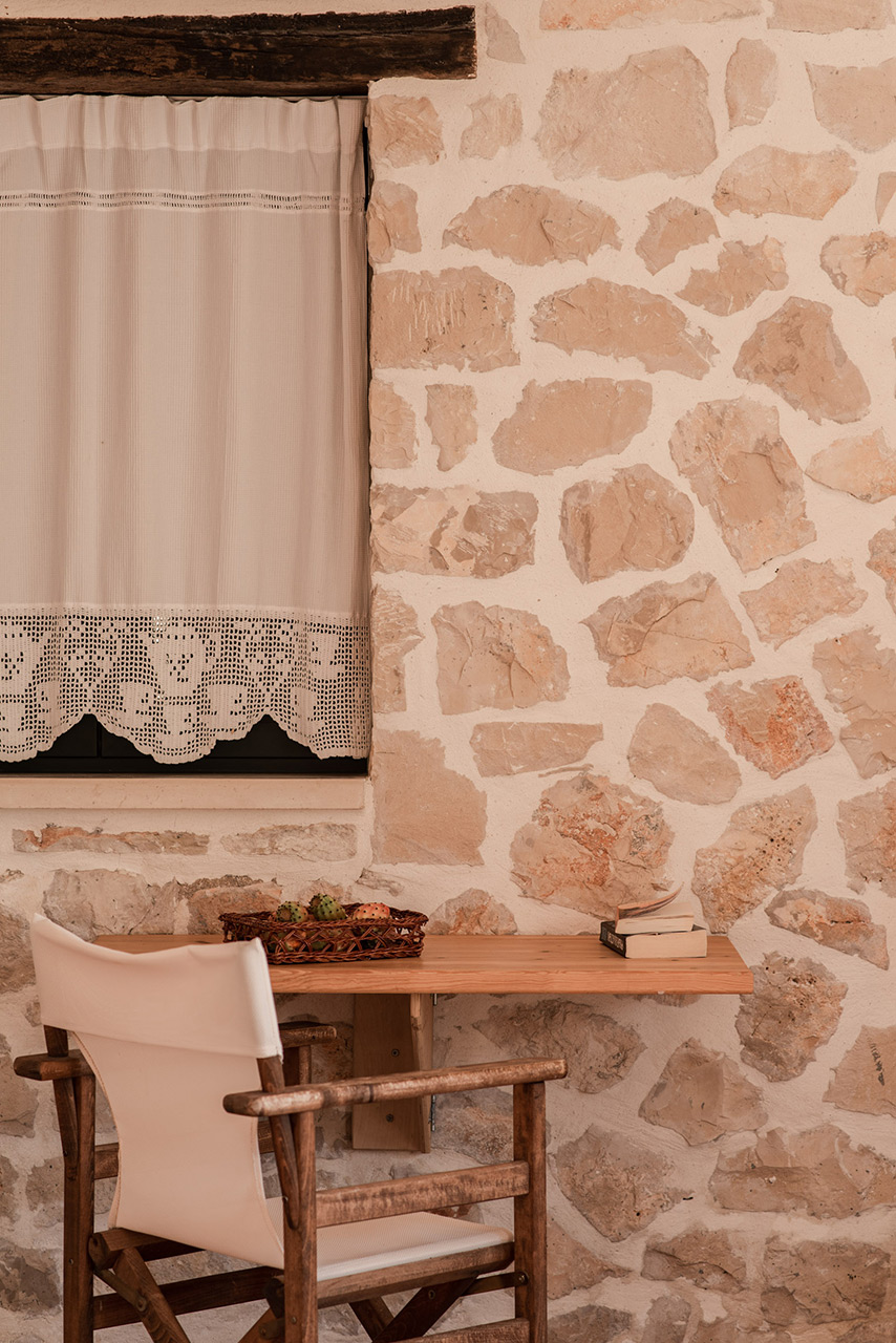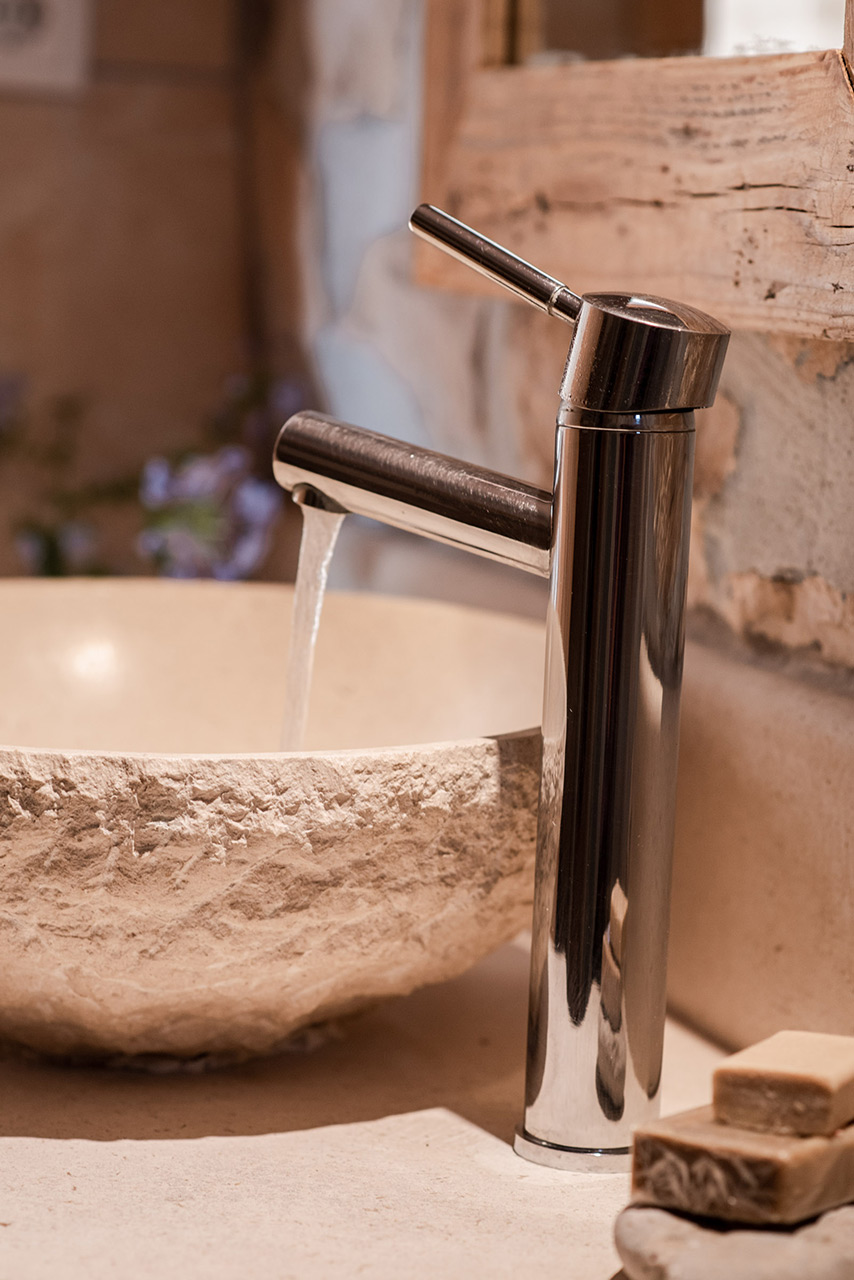 Το κατάλυμα είναι πέτρινο και μάλιστα χτισμένο πάνω σε ένα βράχο στη βάση του οποίου υπάρχει μια πραγματική μικρή σπηλιά, φροντισμένη και φωτισμένη με υπέροχους συνδιασμούς. Η κουζίνα είναι πλήρως εξοπλισμένη με φούρνο, ψυγείο, πλυντήριο πιάτων ενώ στο μπάνιο που είναι φτιαγμένο από πέτρα επίσης θα βρείτε ντουζ με στήλη υδρομασάζ και βέβαια πλυντήριο ρούχων και πιστολάκι μαλλιών.